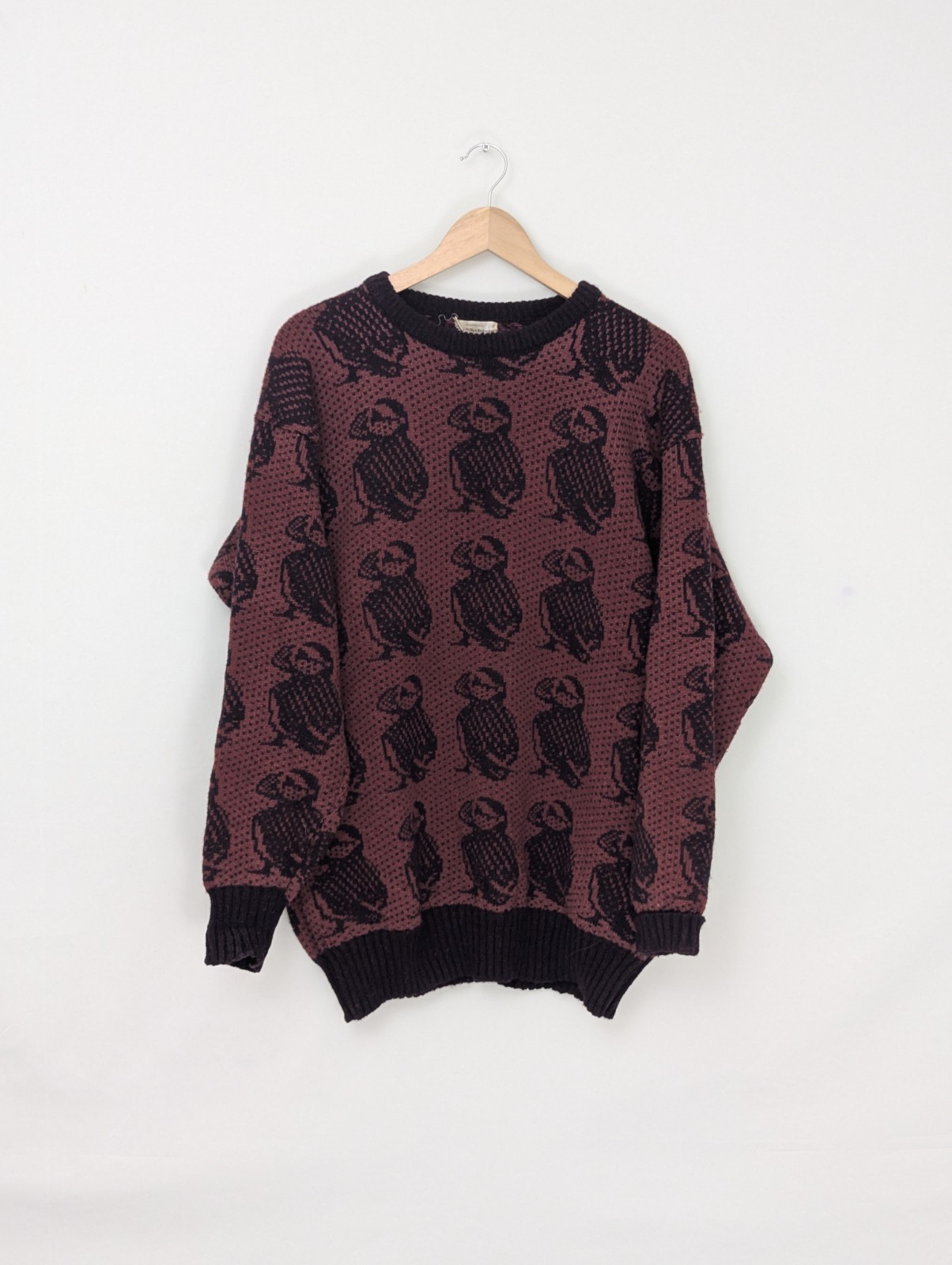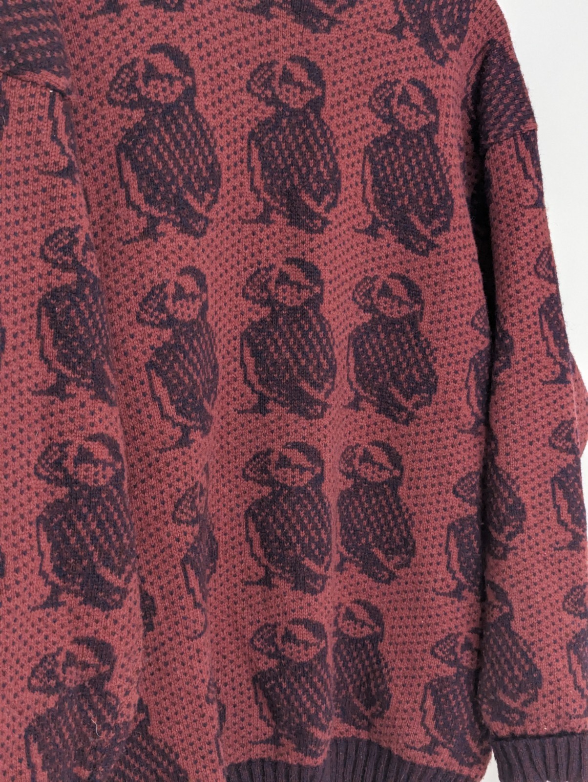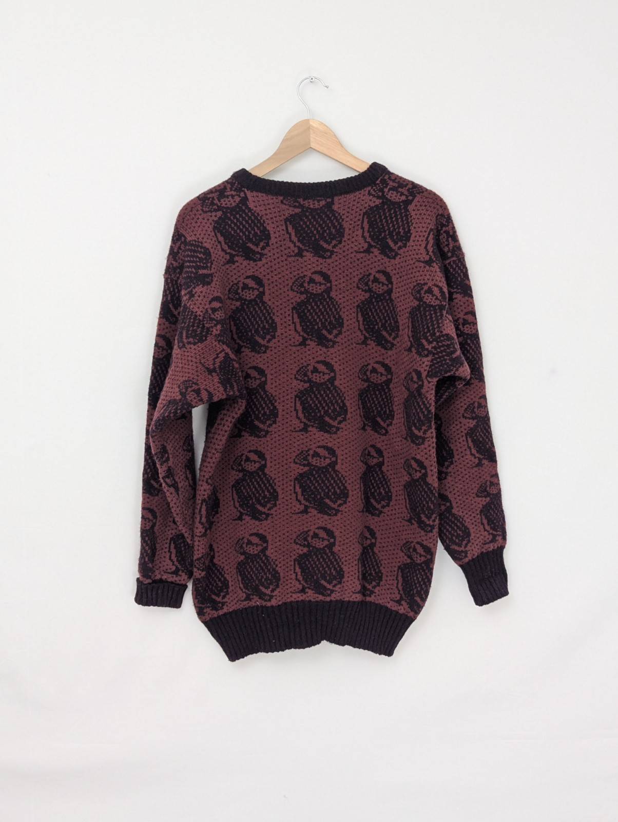 Vintage Sally Phillips Knitwear jumper made from 100% pure wool, featuring an all-over puffin pattern in a burgundy and black colourway.