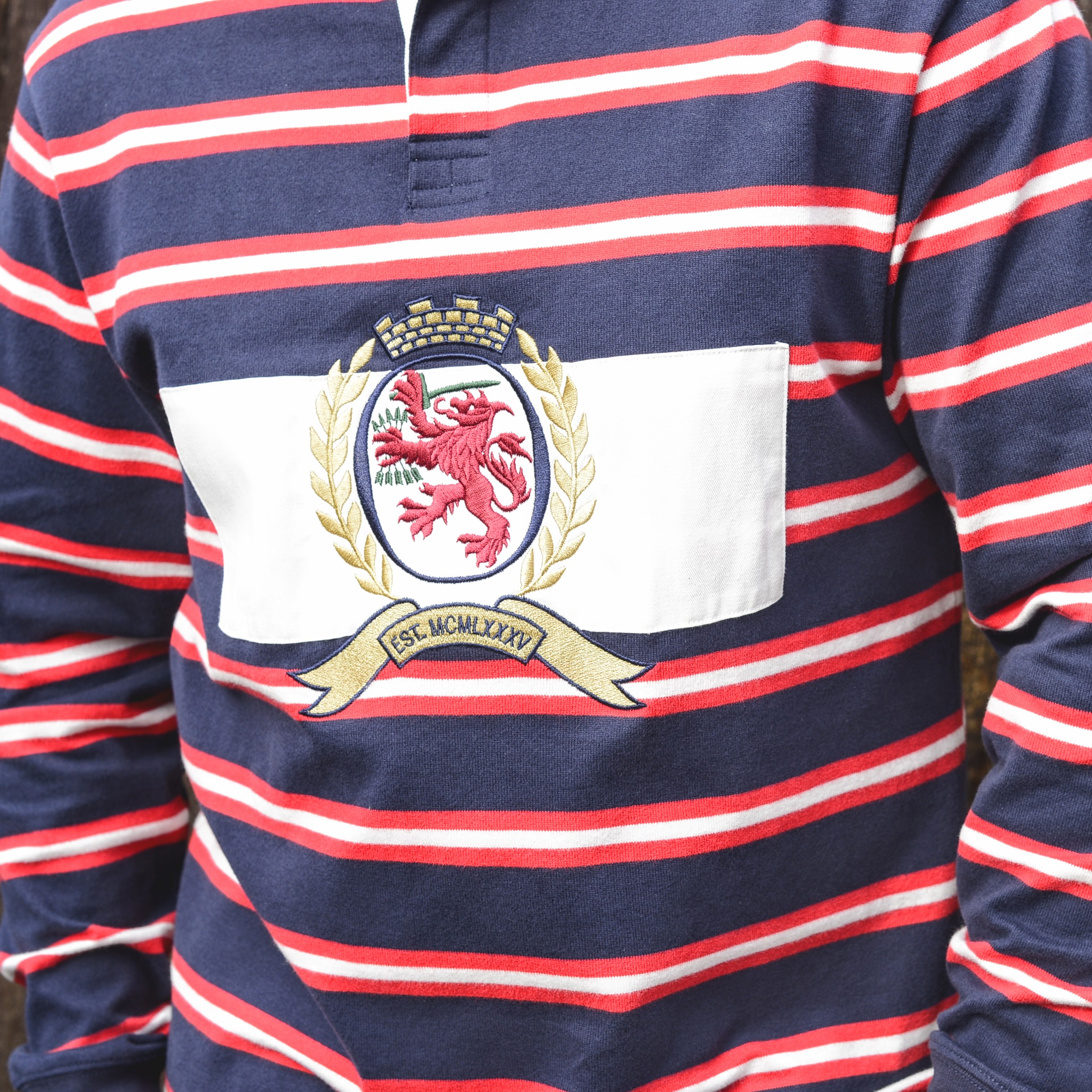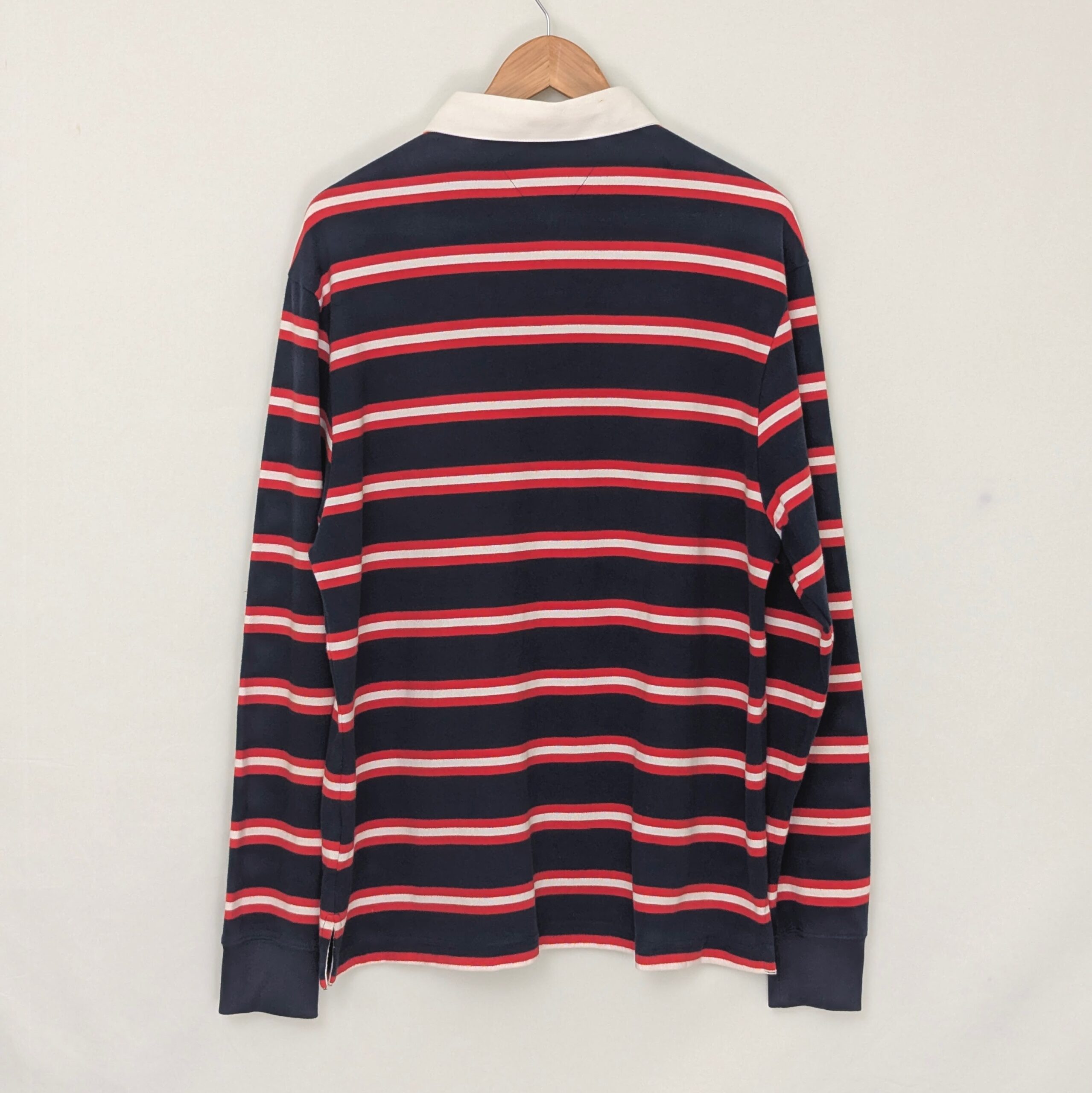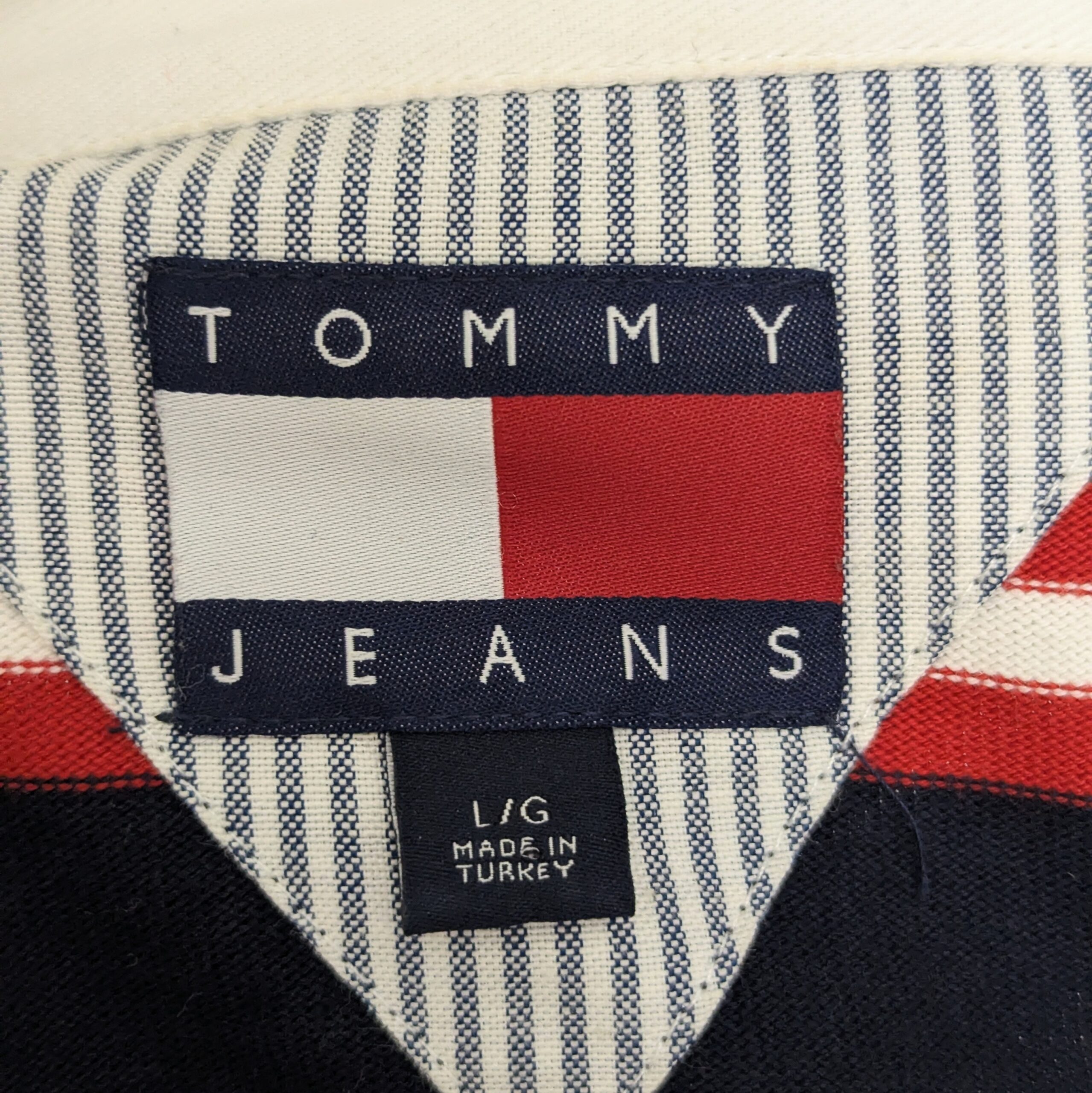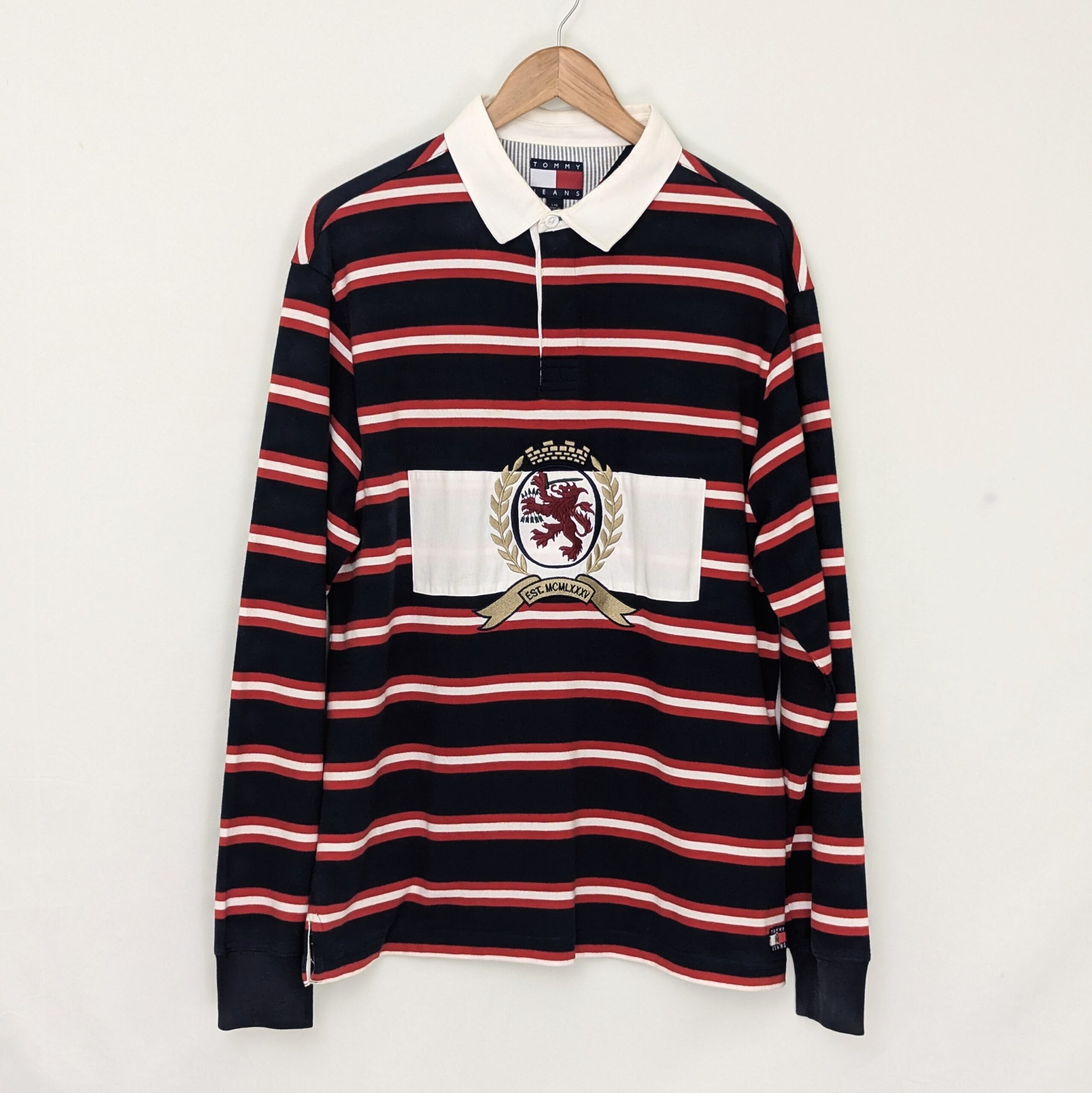 Vintage Tommy Jeans rugby shirt featuring a bold navy, red, and white striped design with a large embroidered crest across the chest. Classic long sleeve rugby style with a structured collar and heavyweight cotton feel.