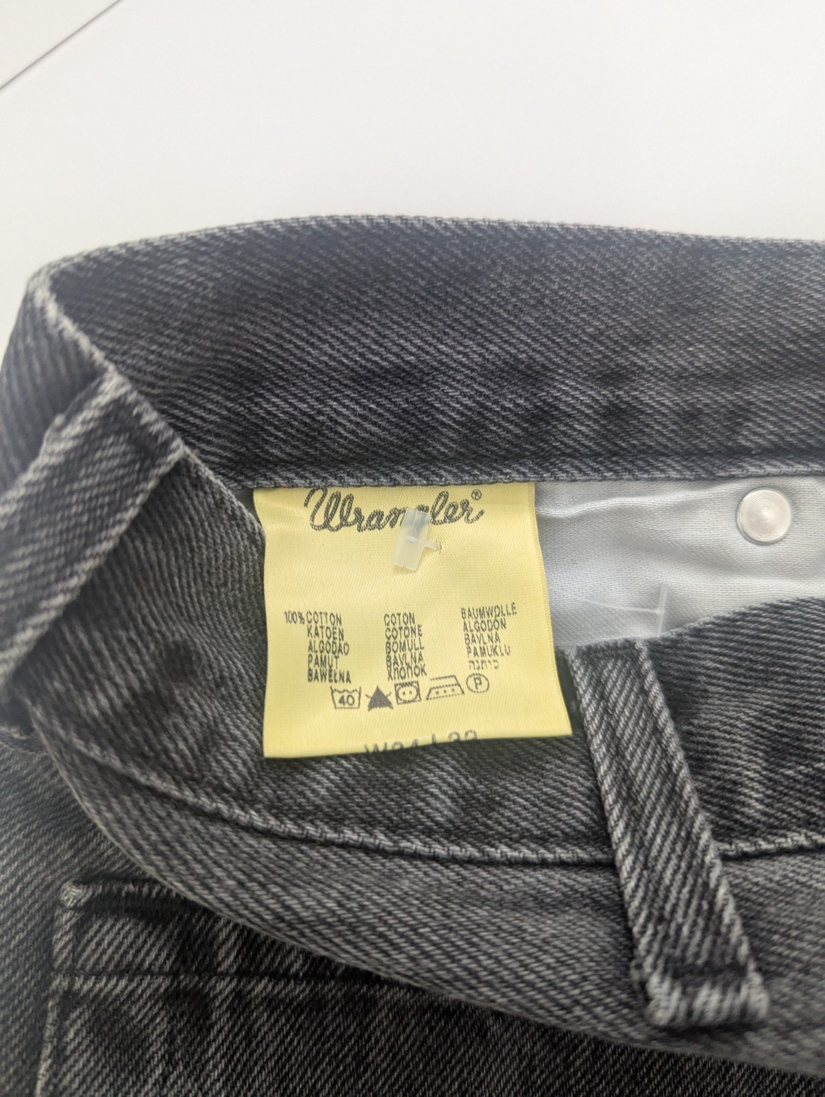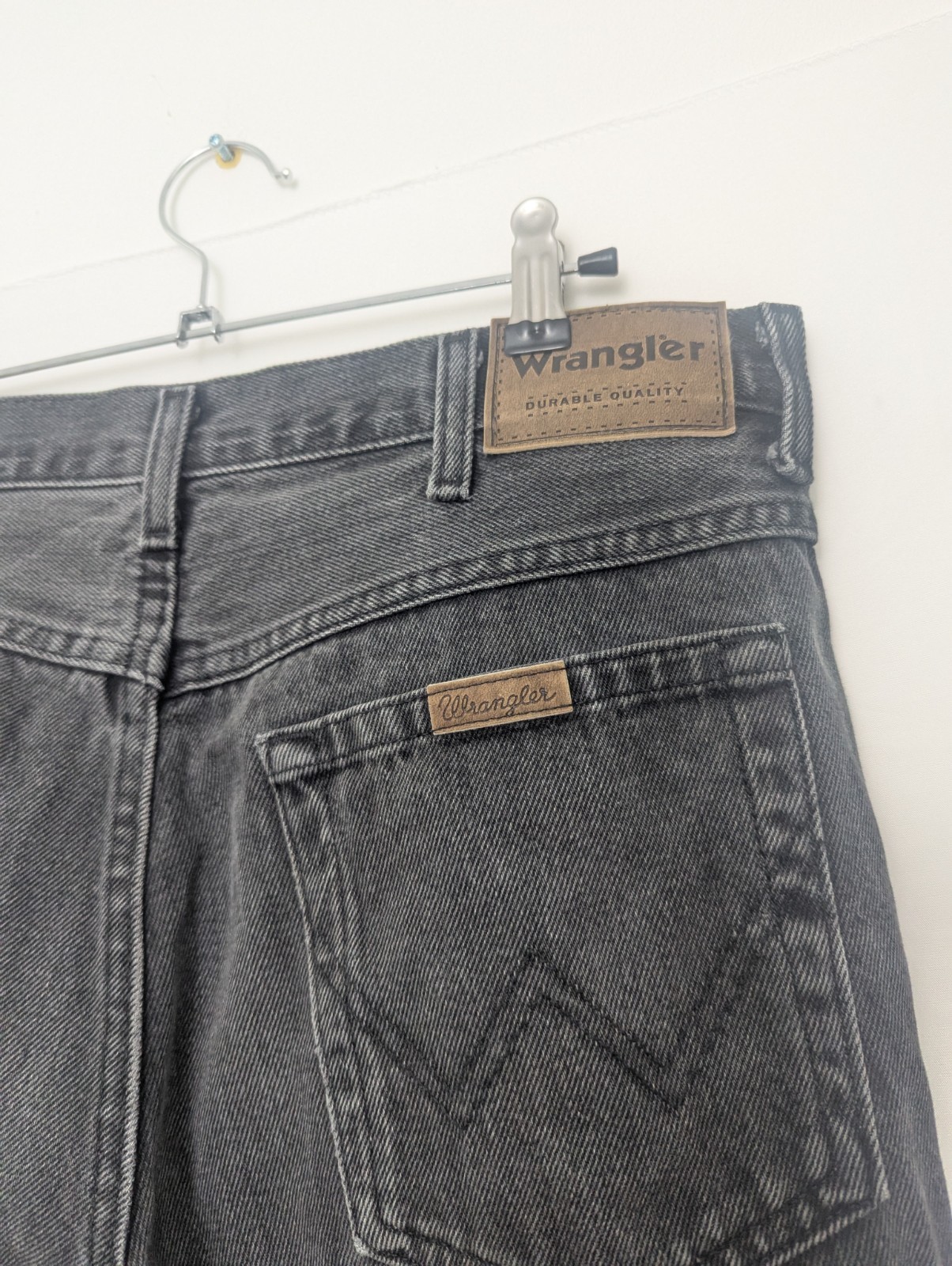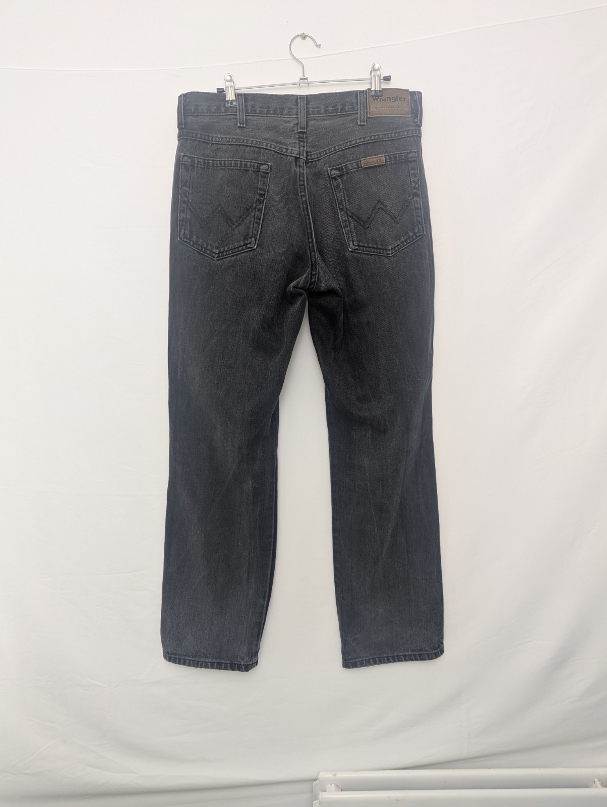 Classic Wrangler jeans in a dark grey washed denim, dating from the early 2010s. Features signature “W” stitching on the back pockets and leather Wrangler patch at the waistband.